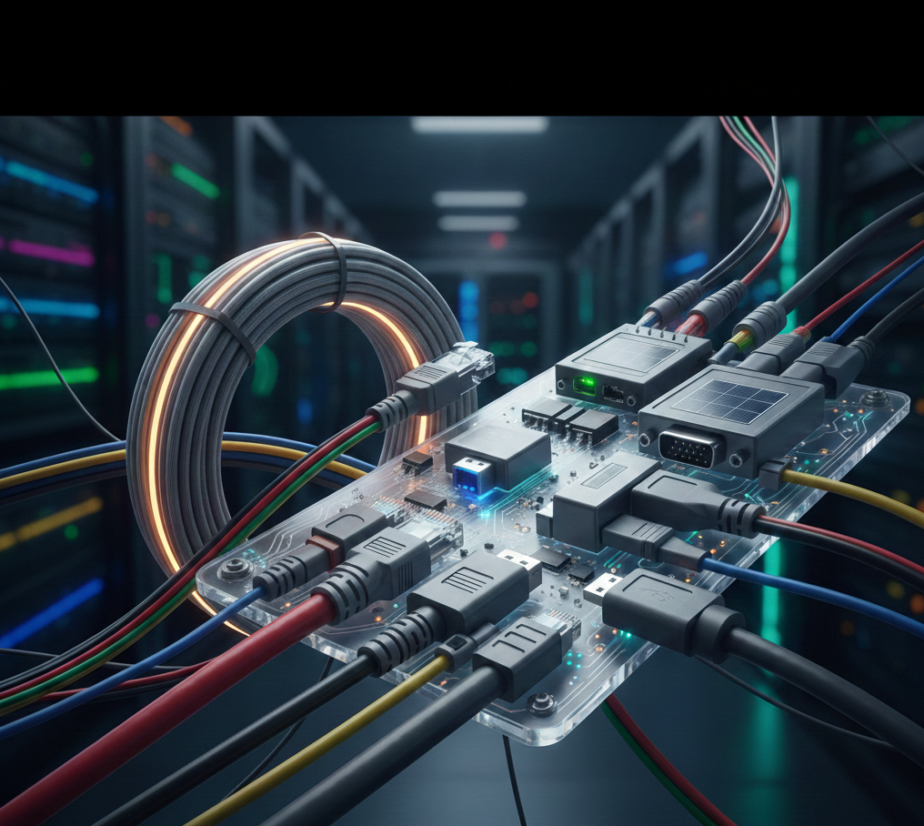 Inclui todos os elementos necessários para ligação e transmissão de dados, energia e sinal de vídeo.