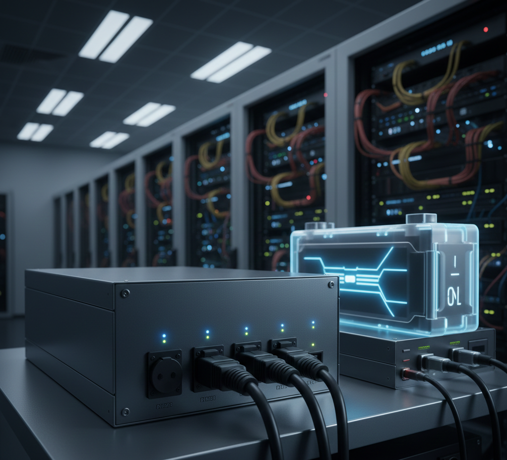 As fontes de alimentação estabilizam a corrente elétrica, enquanto os sistemas UPS garantem autonomia temporária em caso de corte de energia.